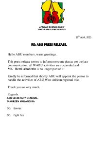 The African Boxing Union (ABU) is expected to appoint a caretaker/interim president in the coming days to oversee the subsequent activities of the Union.